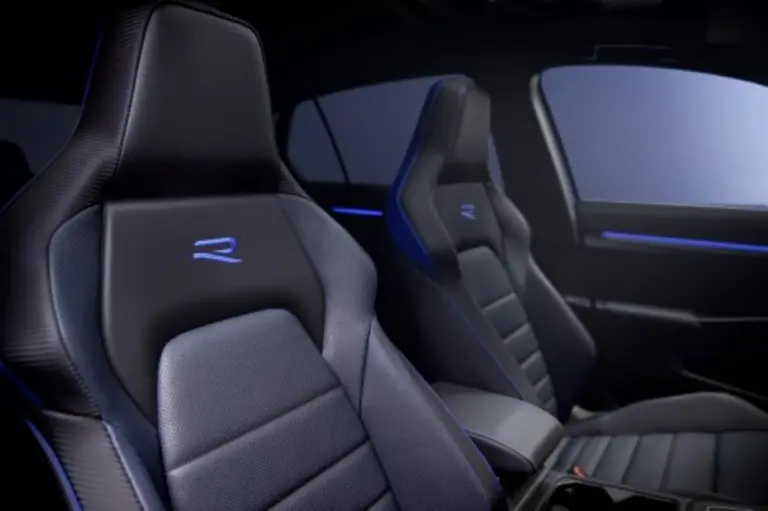 Het interieur herinnert je eraan dat je in een Golf R rijdt. De blauwe R-kleur keert terug in de bekleding en stiksels, maar ook in het digitale dashboard. De blauwe interieurverlichting maakt het helemaal af.