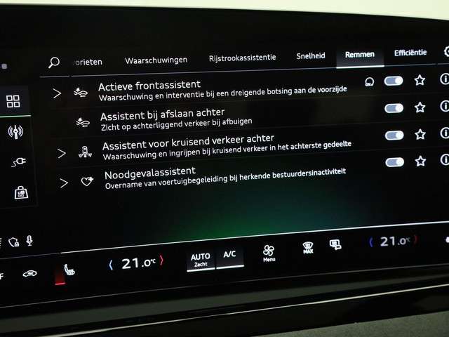 Deze Audi biedt u niet alleen comfort en rijplezier, maar ook veiligheid. Actieve veiligheidssystemen houden voor u de weg in de gaten en reageren op onvoorziene situaties voordat u dat kunt. Onderweg zorgt verkeersborddetectie ervoor dat u geen waarschuwingsbord mist. Met het Lane-keeping systeem gaat u nooit onbedoeld over de streep. Kop-staartbotsingen vormen een belangrijk deel van de meest voorkomende aanrijdingen. De forward collision warning van deze auto voorkomt zulke botsingen geheel of reduceert de ernst van de schade aanzienlijk. In deze Audi vinden we verder een dodehoekdetectie, front assist, vermoeidheidsherkenning en frontale botsbescherming.