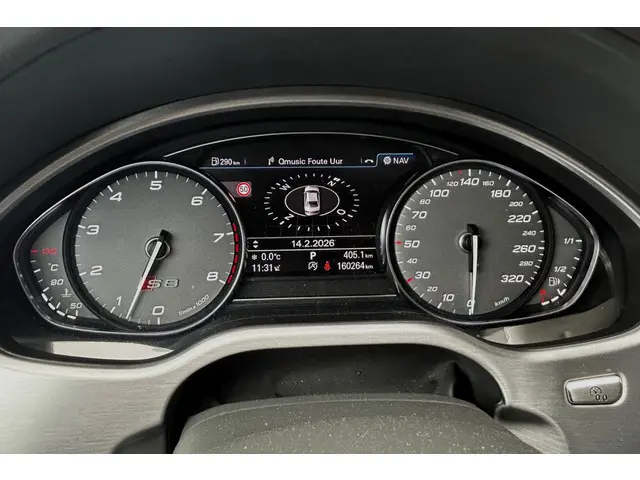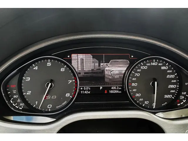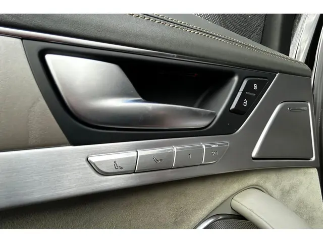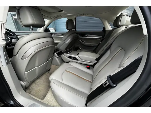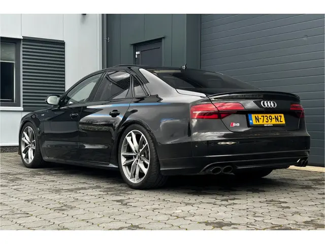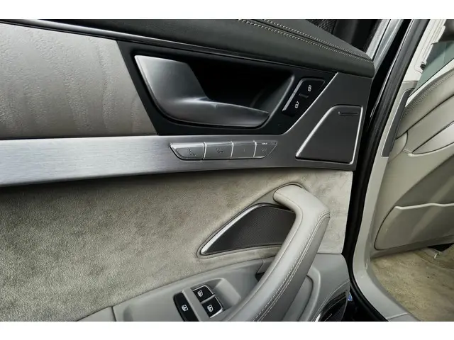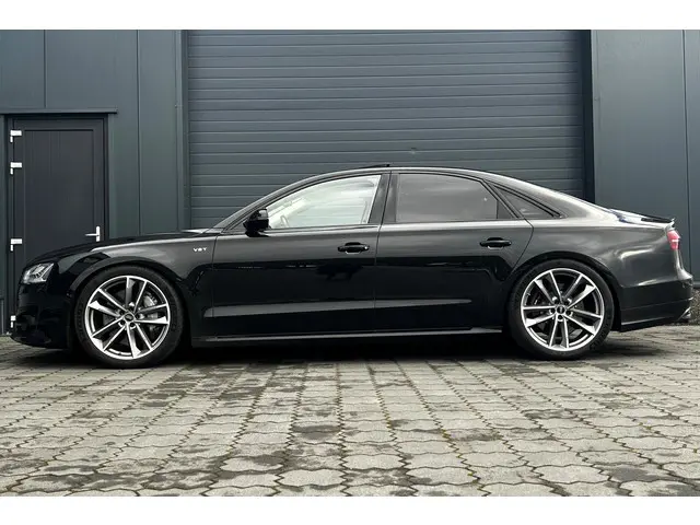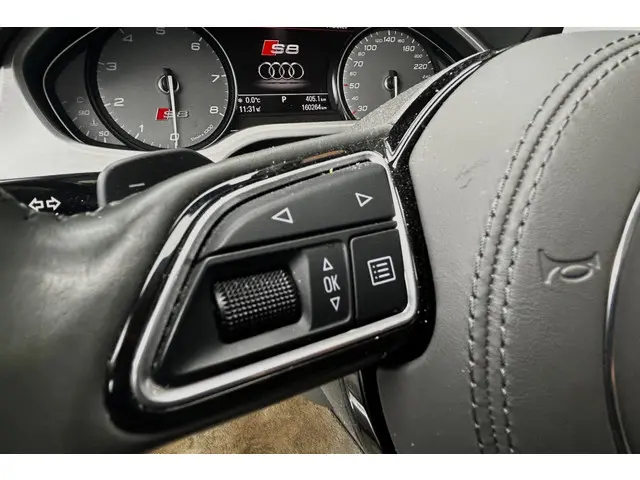 Chique en sportief! Zeer mooie en echt bomvolle Audi S8, de absolute top van de Audi A8 range, in Mythos Black metallic met een grijs lederen Audi Design Selection interieur met aluminiumafwerking, contrasterende stiksels en alcantara hemelbekleding! De S8 is voorzien van de prachtig klinkende 4.0 V8 turbomotor met maar liefst 605pk en natuurlijk quattro aandrijving en keramische remmen. Dit exemplaar is verder voorzien van 21" Audi Sport wielen, luchtvering, zwart optiek pakket met carbon exterieurafwerking, matrix LED koplampen en LED achterlichten met dynamische knipperlichten, elektrisch solar schuif-/kanteldak, B&O (Bang & Olufsen Advanced 1200w) met DAB, bluetooth, navigatie, nightvision, elektrisch verstelbare comfortstoelen met geheugen, elektrisch verstelbare stuurkolom, stoelverwarming en stoelventilatie voor en achter, elektrisch verstelbare stoelen achterin, massagestoelen voor en achter, 4 zone climate control, standkachel, adaptieve cruise control, dodehoekdetectie, Head-Up display, PDC voor en achter met automatisch inparkeren en 360 graden camera, privacy glass, keyless entry, zonneschermen achter, sfeerverlichting, softclose, enz. enz. NIEUWPRIJS RUIM € 243.000,-! Volledig dealeronderhouden auto met slechts 159983km, 2 sleutels, volledige onderhoudshistorie en NAP aanwezig!Meer informatie