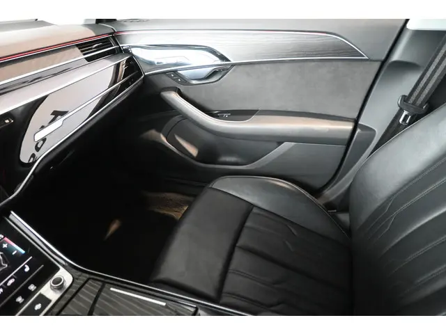 Uw nieuwe auto staat klaar voor vertrek. Stap gerust in, deze Audi A8 heeft 110986 kilometer gelopen en is van het bouwjaar 2018. De aandrijving wordt verzorgd door een zescilinder benzinemotor en een automatische transmissie. De hoogwaardige, lederen bekleding benadrukt de kwaliteit van deze Audi. Neem plaats op de comfortabele stoelen. Dankzij de elektrische bediening en het geheugen is het eenvoudig om hierin de beste zitpositie te vinden. Laat ze achterin ook maar genieten: deze Audi A8 is uitgevoerd met een verwarmde achterbank. In deze auto profiteert u onder andere ook van: elektrische zonnerollo voor de achterruit, 19 inch lichtmetalen velgen, adaptief dempingsysteem, warmtewerend glas, adaptieve verlichting en LED-achterlichten.De 360 graden camera op deze auto biedt u een volledig, panoramisch zicht op de omgeving. Naast handmatige bediening kunt u belangrijke functies met uw stem bedienen dankzij de ingebouwde spraakbediening. In deze auto klinkt uw favoriete muziek nog beter dankzij het high performance audiosysteem. Het navigatiesysteem met harde schijf brengt u soepel en vlot naar uw bestemming. Geniet van een ruime selectie digitale radiostations met de DAB-ontvanger. Deze auto is voorzien van regensensor, cruise control, keyless entry, airco achter, automatisch dimmende buitenspiegels en isofix-aansluiting.