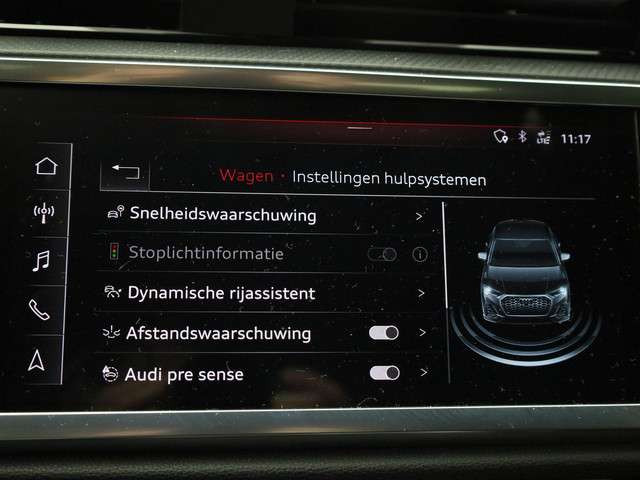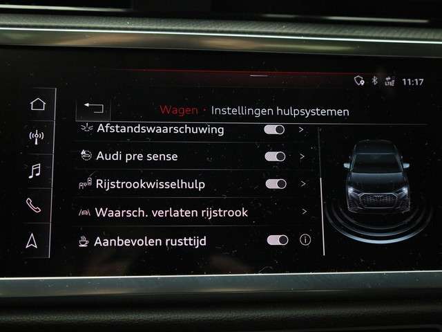 Pragmatisch en veilig als deze auto is, beschikt hij over diverse veiligheidssystemen. Een belangrijke bijdrage aan de veiligheid onderweg levert de verkeersbord-detectie in deze Audi. Onbedoeld buiten de rijstrook raken wordt voorkomen door het Lane-keeping systeem. Onbedoeld bumperkleven is er niet bij, dankzij de forward collision warning. Die waarschuwt direct als een botsrisico met uw voorligger dreigt. Verder is deze auto uitgerust met dodehoekdetectie, hill hold functie, frontale botsbescherming en bandenspanningcontrolesysteem.