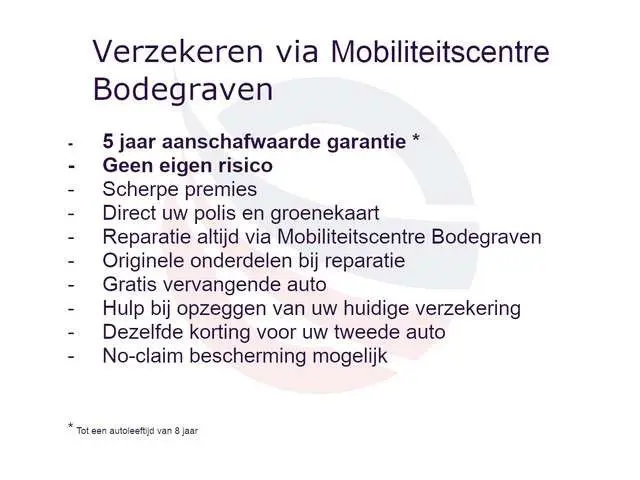 Afleverpakket PERFECT € 995: 12 maanden BOVAG garantie, Onderhoud naar fabrieksschema, Minimaal één jaar APK, Professionele reconditionering van in- en exterieur inclusief polijsten, Vervangen van slijtagegevoelige onderdelen die binnen 10.000 KM en/of 6 maanden aan vervanging toe zijn, 1 jaar Mobiliteitsservice met woonplaats en Europadekking, 1 jaar gratis vervangen van lampjes (Exl. Interieur- en ledverlichting), repareren van lekke band, vullen van olie en van ruiten- koelvloeistof wanneer dat nodig is, Gratis tussentijdse aircocheck, zomercheck en wintercheck, Minimaal halve tank brandstof