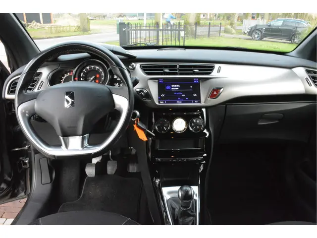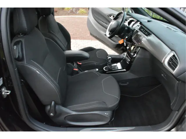Neem plaats in de cockpit, start de motor en voel het vermogen. Met deze sportieve DS 3 hebt u altijd de controle. In deze auto vindt u een benzinemotor en een handgeschakelde vijfversnellingsbak. Winters instappen is er niet meer bij dankzij de stoelverwarming. Verder is de DS uitgerust met: 17 inch lichtmetalen velgen, LED-dagrijverlichting, zwarte hemelbekleding, donker getint glas achter, in delen neerklapbare achterbank en snelheidsafhankelijke stuurbekrachtiging.Het audio-installatiesysteem is gecombineerd met het navigatiesysteem en geeft u de keus om onderweg te luisteren wat u wilt. Route- en verkeersinfo, uw favoriete albums en radioprogramma's, podcasts, luisterboeken... zeg het maar. Deze auto heeft ook bluetooth en DAB+ aan boord. Ook over uw schouder ziet u onderweg niet alles wat er aan de achterzijde gebeurt. Daarom heeft deze DS 3 een achteropkomend verkeer waarschuwing. Nooit meer te warm of te koud. De automatische airconditioning zorgt altijd voor de temperatuur die u kiest. De parkeersensoren registreren alles. Ook dat ene paaltje dat net buiten uw gezichtsveld valt. De automatische ruitenwissers schakelen zichzelf automatisch in en uit en houden de voorruit schoon. Wat u ook in deze auto kunt vinden zijn cruise control, buitentemperatuurmeter, automatisch dimmende binnenspiegel, lederen stuur, isofix-aansluiting en centrale deurvergrendeling met afstandsbediening.