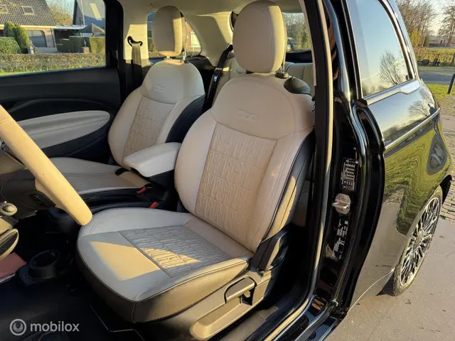 Fiat 500E la Prima cabrio 42 KWH bouwjaar 2022 luxe uitvoering met lage km stand. Full option o.a Vol leder leder interieur, groot Navi/CarPlay scherm, aut airco, parkeer camera, 17inch velgen, zwaarste accu pakket met groot rijbereik, adaptieve cruise control. Auto verkeerd in nette staat .