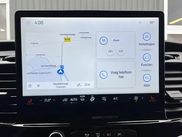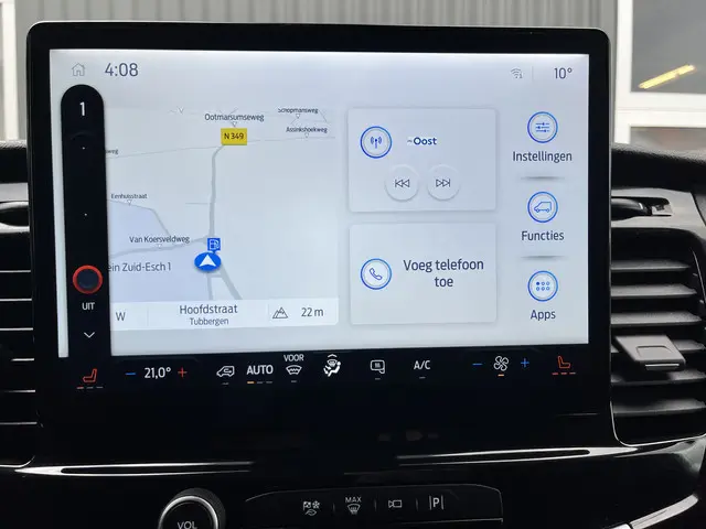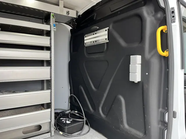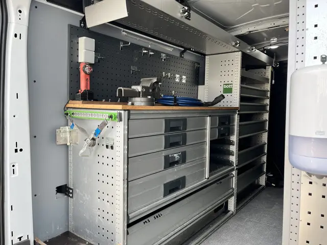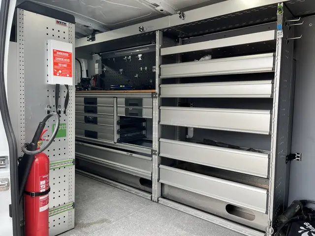 Een zeer nette 100% Electrische Ford E-Transit 350 L3H2 68kWh met Kastinrichting Werkplaatsinrichting Airco Cruise controle 360° Camera Navigatiesysteem Telefoonverbinding Parkeersensoren voor en achter 2-Persoons Oplaadkabels Stoelverwarming Bottinrichtingprijs is excl btw 21% netto