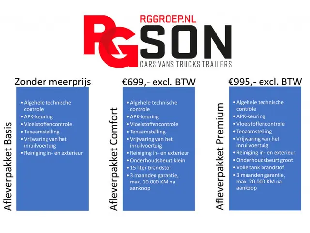 RG Son besteedt veel aandacht aan een juiste aflevering van de door u aangeschafte occasion. Daarom worden al onze bedrijfswagens voor gecontroleerd alvorens ze verkocht worden.Wij leveren iedere auto af met een geldige APK, vloeistoffen controle en reiniging van zowel in- als exterieur. Ook de kosten voor tenaamstelling en vrijwaring van uw eventuele inruilauto zit bij onze verkoopprijs inbegrepen.