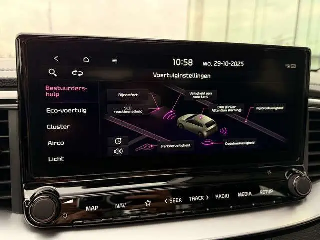 Pragmatisch en veilig als deze auto is, beschikt hij over diverse veiligheidssystemen. Dat de auto steeds meer taken van de bestuurder overneemt, merkt u bijvoorbeeld aan het systeem voor verkeersbord-detectie in deze auto. Het Lane-keeping systeem zorgt dat u mooi binnen de lijntjes blijft. Ongemerkt buiten de rijstrook komen is er niet meer bij. Forward collision warning helpt u om kop-staart aanrijdingen te voorkomen. Ook helpen het hill hold functie, vermoeidheidsherkenning, autonoom remsysteem en bandenspanningcontrolesysteem, uw rit tot een veilige rit te maken.