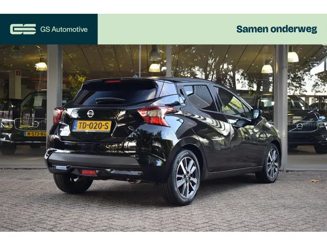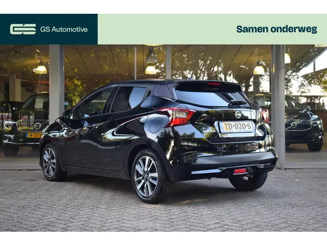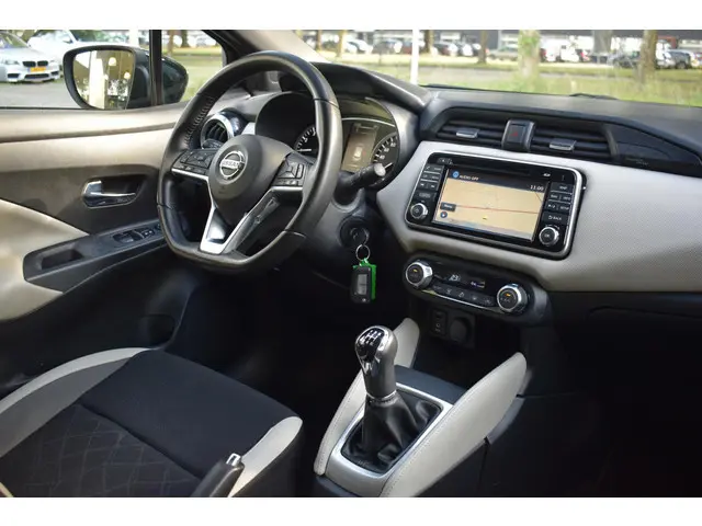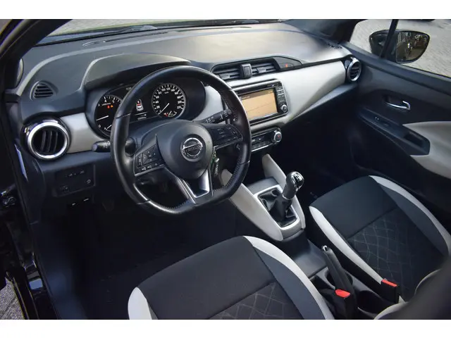 Zo'n kleinere auto heeft een lading aan pluspunten. Manoeuvreren in de stad, lage kosten en toch maximaal genieten! Met zijn pittige motor stuurt u deze auto vlot door het verkeer heen. Verder is de Nissan uitgerust met: 16 inch lichtmetalen velgen, LED-dagrijverlichting, extra getint glas, in delen neerklapbare achterbank en snelheidsafhankelijke stuurbekrachtiging.Ook achter de auto geen verrassingen bij het inparkeren. Daarvoor zorgt de achteruitrijcamera. Zorgeloos en geconcentreerd rijden? Het full map navigatiesysteem wijst de weg! Of het buiten nu warm is of koud, dankzij automatische airconditioning is het binnen altijd behaaglijk. Alle belangrijke audiofuncties heeft u onder handbereik met de audiobediening op het stuur. De DAB-ontvanger zorgt voor een ruime keuze uit digitale radiozenders en een kristalheldere geluidsweergave. Ook regensensor, cruise control, lederen stuur, centrale deurvergrendeling met afstandsbediening en boordcomputer zijn aan boord.