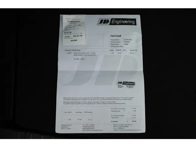 ŠKODA Kodiaq 1.5 TSI Style Business 7p. DSG Getuned door JD van 150pk naar 190pk en van 250 nm koppel naar 320 nm koppel en is voorzien van o.a. Apple CarPlay en Android Auto, achteruitrijcamera, navigatiesysteem, stoelverwarming, keyless entry en go, dodehoek detectie, panoramadak, LED, Achterbank verwarmd etc.Deze auto wordt standaard geleverd met 12 maanden BOVAG garantie, een onderhoudsbeurt volgens fabrieksschema, professionele reiniging binnen- en buitenzijde, 10 liter brandstof, NAP (Nationale Auto Pas) en uitgebreide uitleg van je nieuwe auto.