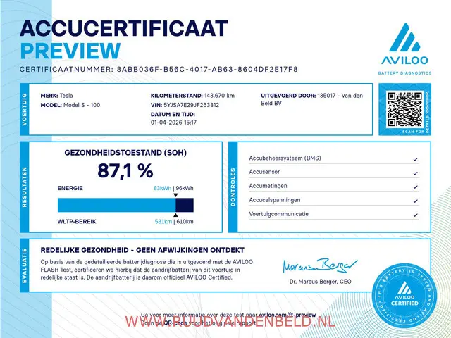 Accu: 100 kWh, Conditie: 87%, Type lithium-ion