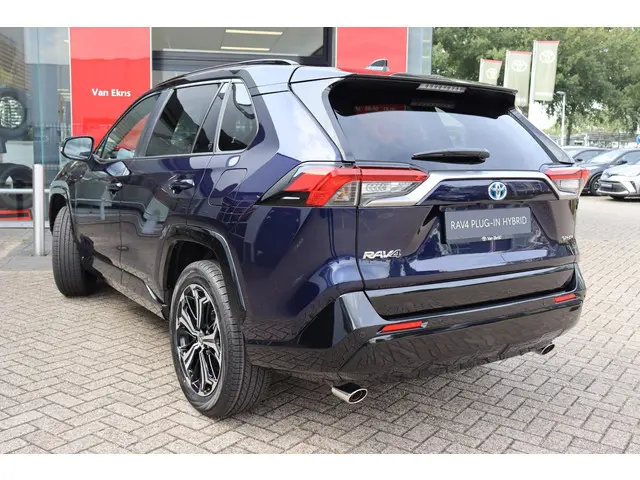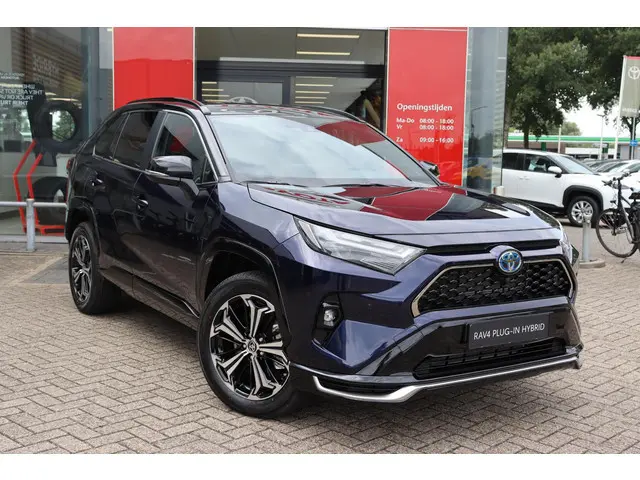 ...RAV4 AWD Plug-In Bi-Tone Plus in de kleur Midnight Blue metallic met zwarte bovenzijde. voorzien van veel luxe optie's zoals parkeersensoren voor en achter met automatische remfunctie, Blind spot monitor, Head up display, JBL audio met subwoofer, 360 graden camera, draadloze telefoonlader, achteruitrij assistent, Camera in binnenspiegel, zwart leder, stoelventilatie en meer!--Tevens voorzien van alarmklasse 3 met certificaat en een trekhaak. Deze auto mag 1.500 KG trekken--