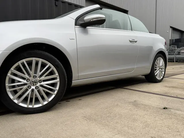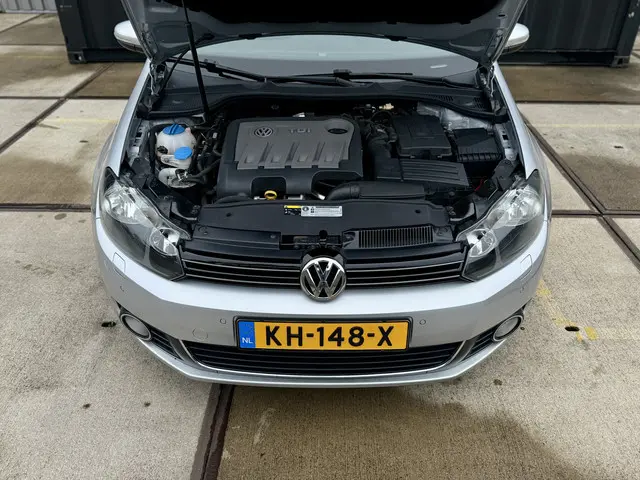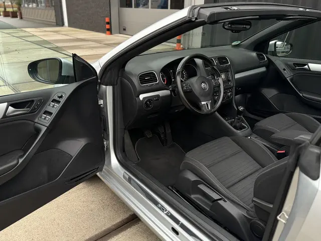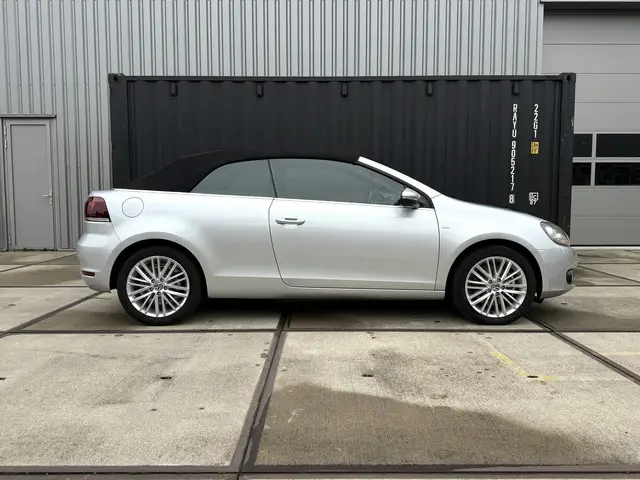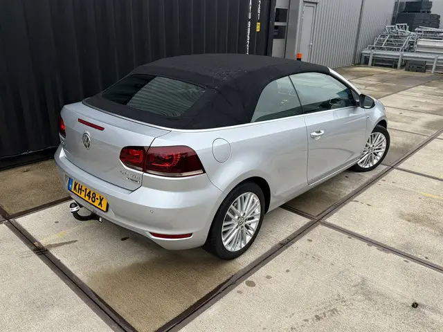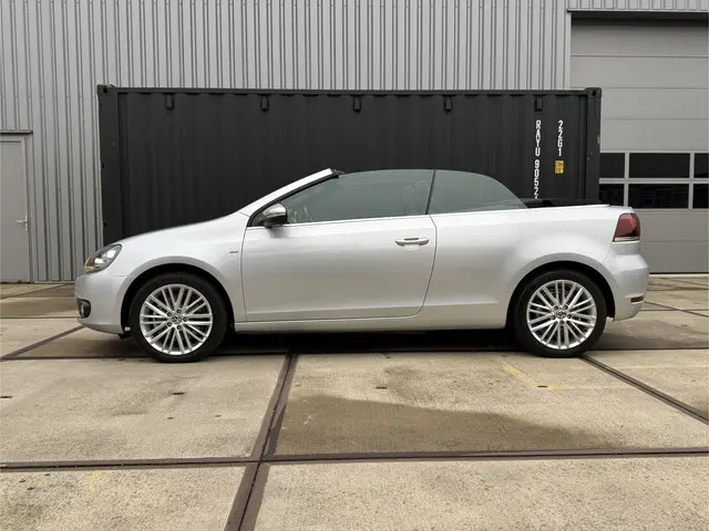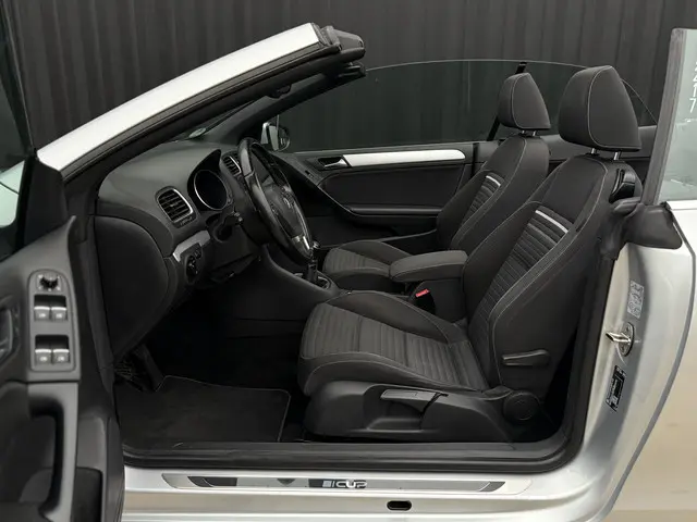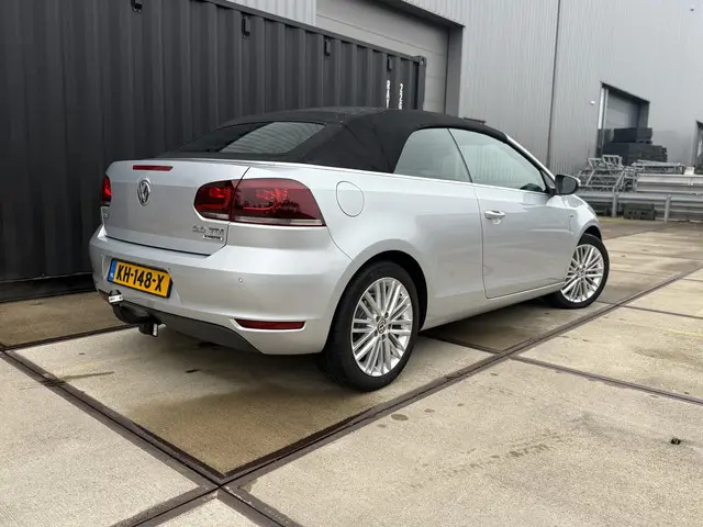 De Golf Cabriolet is de ideale all-rounder op het gebied van comfortabel open rijden, efficiëntie en functionaliteit. Het is één van de veelzijdigste 4-zits cabrio's in zijn klasse en het model profiteert van de hoge kwaliteitsnorm van Volkswagen. Bij deze gave Cup Edition uit 2015 zijn alle gewilde opties aanwezig, denk aan de sportstoelen met verwarming, een achteruitrijcamera, trekhaak [1.500kg trekgewicht], Cruise- en Climate Control en het uitgebreide infotainment met navigatie en Bluetooth. Qua brandstofverbruik zijn er maar weinig cabrio's die aan deze kunnen tippen: 4,5L/100km is gemakkelijk haalbaar. Dat komt door de 2.0-liter 4-cilinder met 140pk onder de kap, in combinatie met BlueMotion-technologie en een handgeschakelde 6-bak. De optische conditie is uitzonderlijk goed, de onderhoudshistorie is compleet en up-to-date. Gereed voor aankomend lente- en zomerseizoen!Ondergedompeld in Reflex Silver metallic maakt de Golf 6 de gedistingeerde indruk die u mag verwachten van een auto van dit formaat. Het accent ligt op de zilveren 17-inch velgen, zwarte soft-top, chromen details, hoogglans zwarte grille en LED-achterlichten. Na binnenkomst hebben wij de remklauwen, wielnaven en -bouten gespoten, waardoor het geheel fris oogt. De Cup-uitvoering heeft standaard een verlaagd sport-onderstel; hierdoor heeft 'ie een stabielere wegligging, zonder dat het ten koste gaat van het comfort. Er is thans veel aandacht besteed aan innerlijk vertoon middels titanium zwarte stoelbekleding met parelgrijze bies, een multifunctioneel lederen sportstuurwiel, geborsteld aluminium dashboard-inleg, sfeerverlichting en een zwarte hemel, welke een ruimtelijke beleving in het interieur creëren. Het windscherm achter de voorstoelen, de achterste ruiten en stoelverwarming zorgen ervoor dat u, ook bij lagere temperaturen, al snel open kan rijden.