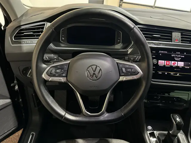 Fraai, lenig en helemaal van nu. Da's het grote voordeel van een jonge auto met nog maar weinig kilometers op de teller. Deze Volkswagen Tiguan is uitgevoerd met R-Line styling en oogt dus supersportief. Een belangrijke eigenschap van iedere Volkswagen is zijn duurzaamheid. Dat ziet u ook aan deze Tiguan. De SUV haalt zijn aandrijving uit een krachtige viercilinder benzinemotor. Een goede zithouding is essentieel voor een fitte rit. Daarom is deze auto uitgerust met comfortstoelen. De elektrisch bedienbare achterklep opent met een druk op de knop. De koplampen zijn voorzien van matrix LED-verlichting waarmee u aanzienlijk verder kan kijken in het donker. Het systeem past zelf de lichtstraal aan op het moment tegenliggers verblind kunnen worden. In deze auto profiteert u onder andere ook van: geluidsisolerende ramen, dakspoiler, in delen neerklapbare achterbank, LED-achterlichten, verstelbare lendensteunen en snelheidsafhankelijke stuurbekrachtiging.Stel de interface voor uw cockpit naar wens in met het digitale dashboard van deze auto. Als u de adaptive cruise control inschakelt, regelt de auto zelf de snelheid en de afstand tot de auto voor u. Zoals u van zo'n jonge auto mag verwachten, zijn hier ook de geavanceerde remote services aanwezig. Simpelweg met een app op uw smartphone controleert u op afstand de status van de auto en bedient u diverse functies. Aan boord bevindt zich een draadloze telefoonlader. Geen kabels of snoertjes - opladen maar! Ook over uw schouder ziet u onderweg niet alles wat er aan de achterzijde gebeurt. Daarom heeft deze Volkswagen Tiguan een achteropkomend verkeer waarschuwing. Wat u ook in deze auto kunt vinden zijn dashboard met spraakbediening, navigatiesysteem, automatische airconditioning, schakelpaddles aan het stuur, DAB ontvangst en parkeersensoren voor en achter.