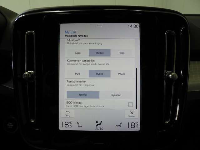 Strak design, een hoog veiligheidsniveau en ingetogen luxe, dat zijn belangrijke eigenschappen van deze Volvo XC40. Deze Volvo XC40 heeft een hybride motor, dus een combi van brandstof en elektrisch. Een slim en milieuvriendelijk systeem dat ook nog eens lekker kostenbesparend is. De bagageruimte is toegankelijk via een comfortverhogende elektrische achterklep. In deze auto profiteert u onder andere ook van: 18 inch lichtmetalen velgen, LED koplampen, sportonderstel, in hoogte verstelbare voorstoelen, extra getint glas en in delen neerklapbare achterbank.Wat ook opvalt, is de strakke en overzichtelijke informatie die het digitale dashboard levert. Boem is ho? Dat is verleden tijd. De achteruitrijcamera laat precies zien hoeveel ruimte u achter nog heeft! Adaptive cruise control is veilig en comfortabel. De snelheidsregelaar houdt automatisch afstand tot het voertuig dat voor u rijdt. Filerijden zal nooit een pretje worden. Maar met de file assistent wordt het wél relaxter. Deze geavanceerde optie zorgt dat u automatisch de juiste afstand tot de voorligger houdt en remt bovendien als de rij tot stilstand komt. Je ziet hem niet, maar hij is er wel: de elektrisch inklapbare trekhaak. Met dashboard met spraakbediening, connected drive services, navigatiesysteem met harde schijf, achteropkomend verkeer waarschuwing, kruisend verkeer detectie en climate control is deze auto helemaal compleet.