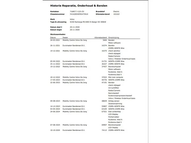 U voelt de onbeperkte kracht van elektrische aandrijving, elke keer als u op weg gaat met deze Volvo XC40. Het is een dealeronderhouden auto uit 2020 die 101622 kilometer heeft gelopen. Gas geven is er met de elektromotor niet meer bij. Stil snelheid maken wel! Een krachtige motor geeft deze auto zijn sportieve prestaties. Veel leuke extra's heeft deze auto. Om maar wat te noemen: de elektrisch bedienbare achterklep en het stijlvolle lederen interieur. Lekker hoor, die verwarmbare voorstoelen. Helemaal op koude dagen. Tot de voorzieningen van deze auto behoren 19 inch lichtmetalen velgen, LED koplampen, sportonderstel, donker getint glas achter, LED-achterlichten en verstelbare lendensteunen.