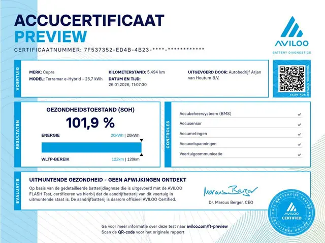 Ben je op zoek naar een stijlvolle en krachtige SUV die van alle gemakken is voorzien? Dan is de Cupra Terramar 1.5 e-Hybrid 200 kW VZ met zijn indrukwekkende specificaties en luxe uitstraling wellicht de perfecte auto voor jou. Deze hybride benzine uit 2025 in elegante zwarte kleur met metallic lak is een pareltje op de weg.Met een vermogen van 177 PK en een cilinderinhoud van 1498 CC, is deze Cupra Terramar niet alleen sterk, maar ook zuinig in verbruik. Met slechts 5472 kilometer op de teller is deze SUV zo goed als nieuw en klaar voor avonturen op de weg.