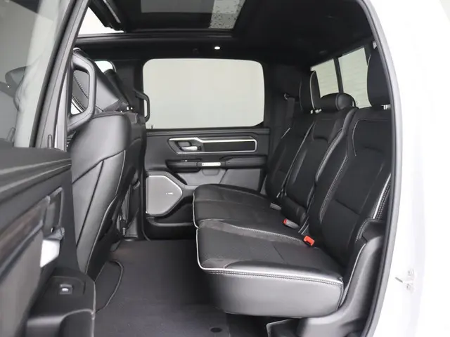 Binnenin ervaar je de luxe van een moderne full-size pick-up. De cabine is ruim, stil en voorzien van geluidsisolerend glas. De lederen bekleding, geventileerde voorstoelen, verwarmde achterbank, elektrisch verstelbare stoelen met geheugen en het verwarmde stuurwiel zorgen voor optimaal comfort in elk seizoen. Dankzij het grote 12 inch multimediascherm, het Harman Kardon premium audiosysteem en het nieuwe interieurdesign voelt de Laramie Night Premium als een luxe SUV, maar dan met de kracht en functionaliteit van een echte Ram 1500. De multifunctionele tailgate maakt laden en lossen eenvoudiger, terwijl het panoramadak de cabine een open en lichte sfeer geeft.