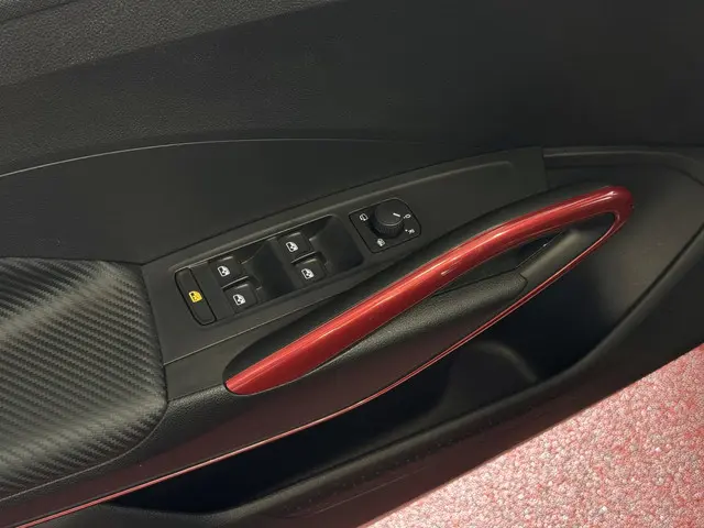 Sportstuur (3-spaaks) en bijbehorende insteekaccenten zoals aluminium pedalen, leder met contrasterende rode stiknaad, carbon-look sierdelen, en ambient-LED-verlichting in rood of wit.