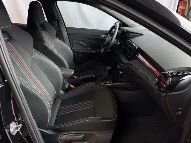 Sportstoelen met geïntegreerde hoofdsteunen in zwart/grijs met rode accenten maken indruk.