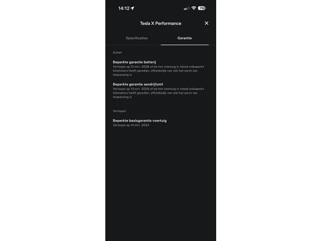 Op de hoogvoltaccu en aandrijflijn is Tesla fabrieksgarantie van toepassing tot maart 2028 of onbeperkt aantal kilometers.